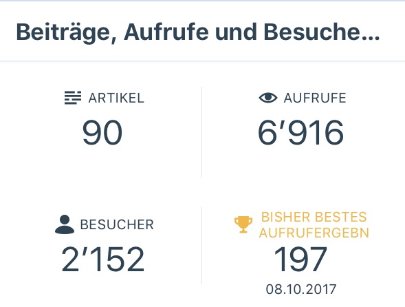 Kaum zu glauben, aber ich habe tatsächlich bereits 90 Texte (90!!!!!!) geschrieben und veröffentlicht. Ich habe 45 Follower (viel mehr als ich jemals zu hoffen gewagt hätte!), das heisst Leute, die benachrichtigt werden, wenn ich etwas veröffentliche. Ich gehe davon aus, dass diese hin und wieder bei mir reinschauen und dazu wohl noch einige andere, wie ich es den Leserzahlen entnehmen kann.