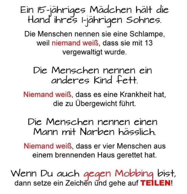 Immer wieder lese ich diese Zeilen, zB bei Facebook. Und ich muss sagen, ich finde die gut. Ich finde gut, dass Menschen gegen Mobbing sind. Dass sie ihre Haltung anderen mitteilen und dies hoffentlich auch genau so praktizieren und vorleben.