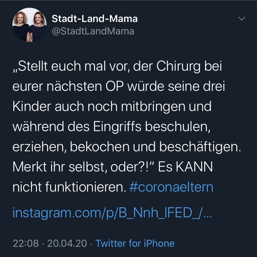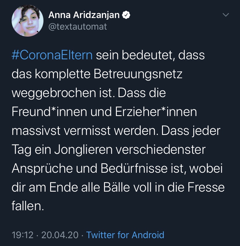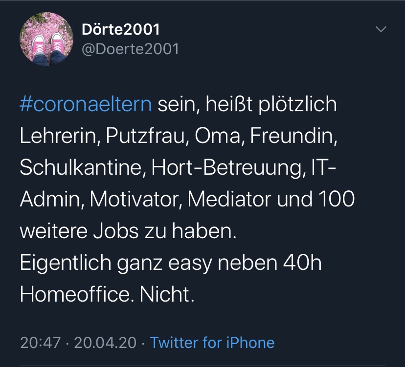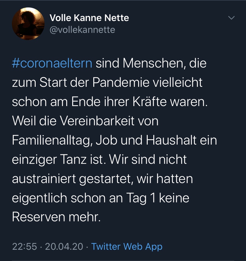 Wie die Frau es oben im Bild treffend beschreibt, so geht es mir auch. Ich bin eigentlich immer ganz gut ausgelastet, auch ohne Corona. Und das ist keinesfalls, weil ich schwach bin oder unfähig, sondern es ist einfach viel. Es ist halt all das, was in unserer Gesellschaft immer noch als normal angesehen wird, wenn es zwei Menschen tragen. Vater und Mutter. Wenn dies nicht der Fall ist, muss man weiterhin so funktionieren, als wäre man zwei Personen.