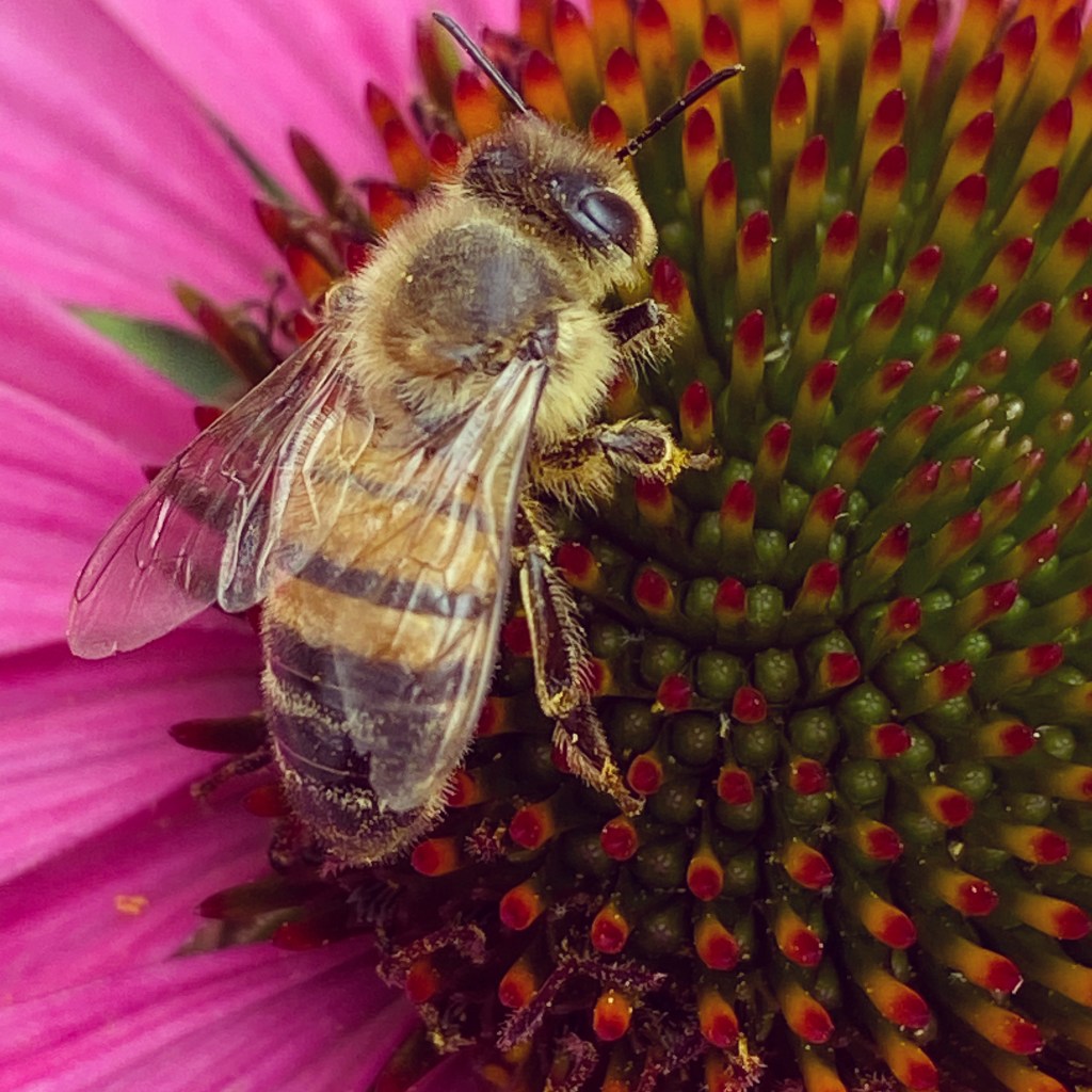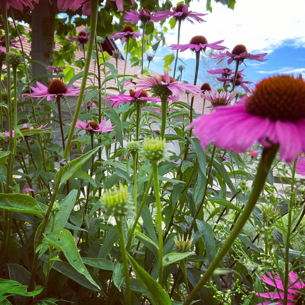 Mir haben an diesem Tag die Blumen auf dem unteren Bild besonders gut gefallen. Wenn ich mich nicht irre, sind das Purpurne Sonnenhüte, wie auch diejenige mit dem Bienen-Roboter vorhin. Sie haben eine recht grosse Blüte und fallen dank ihrer Farbe ziemlich auf. Jedenfalls hatte es da viele von denen.