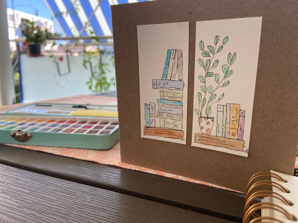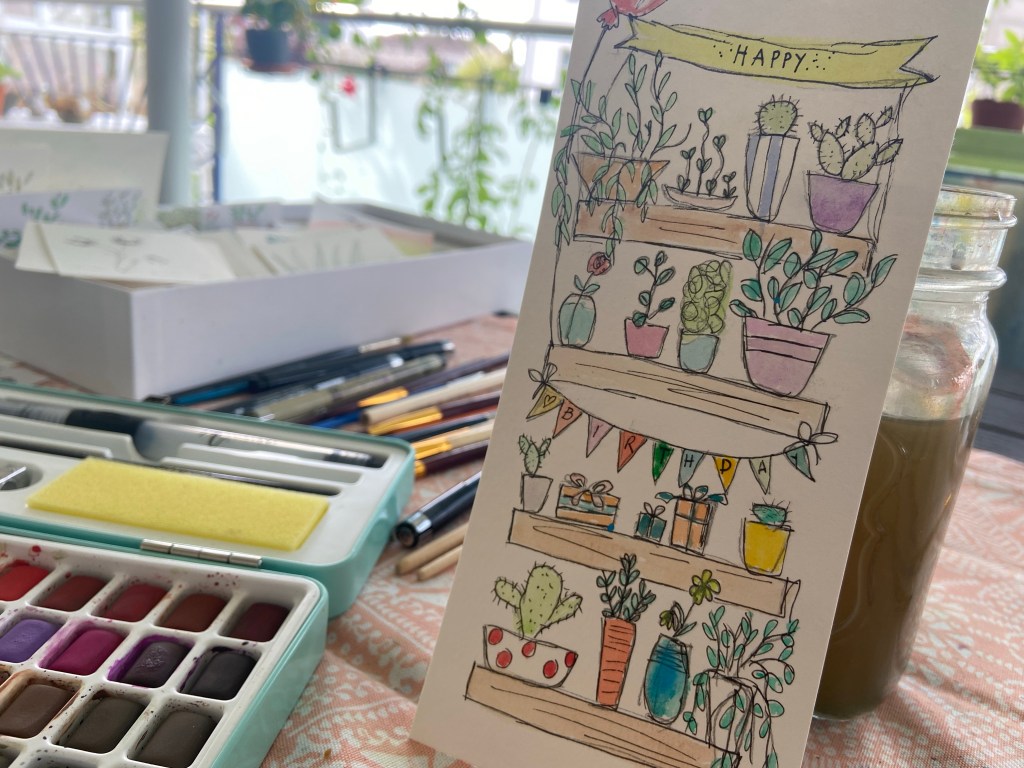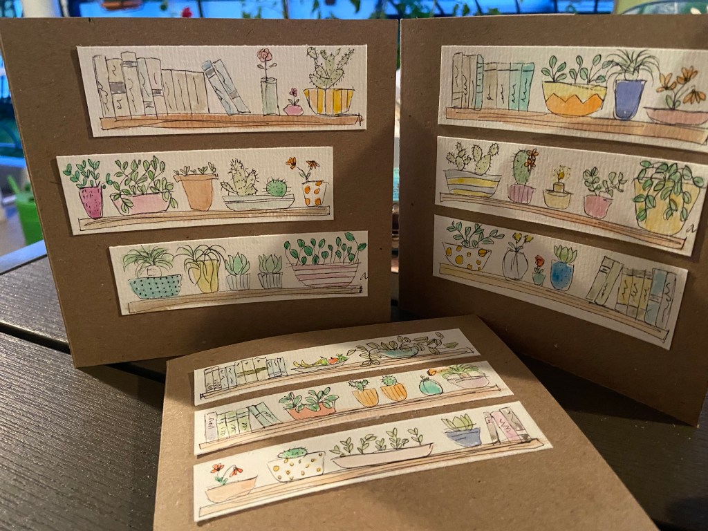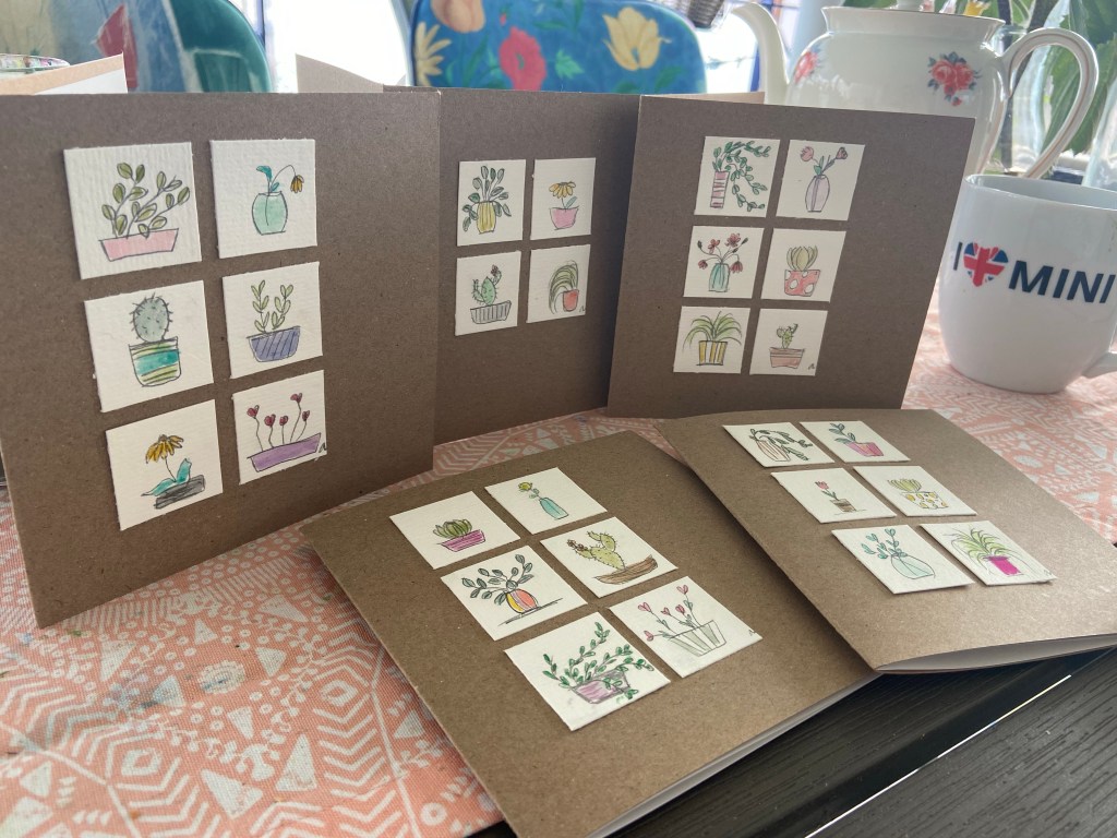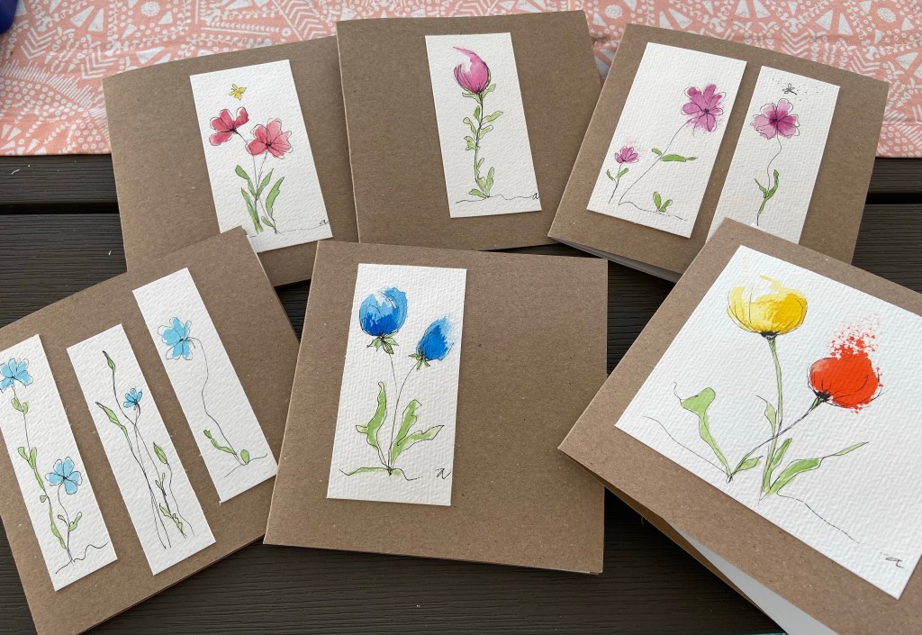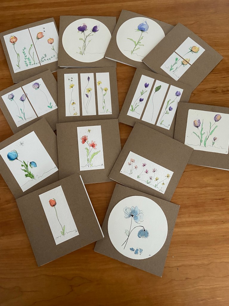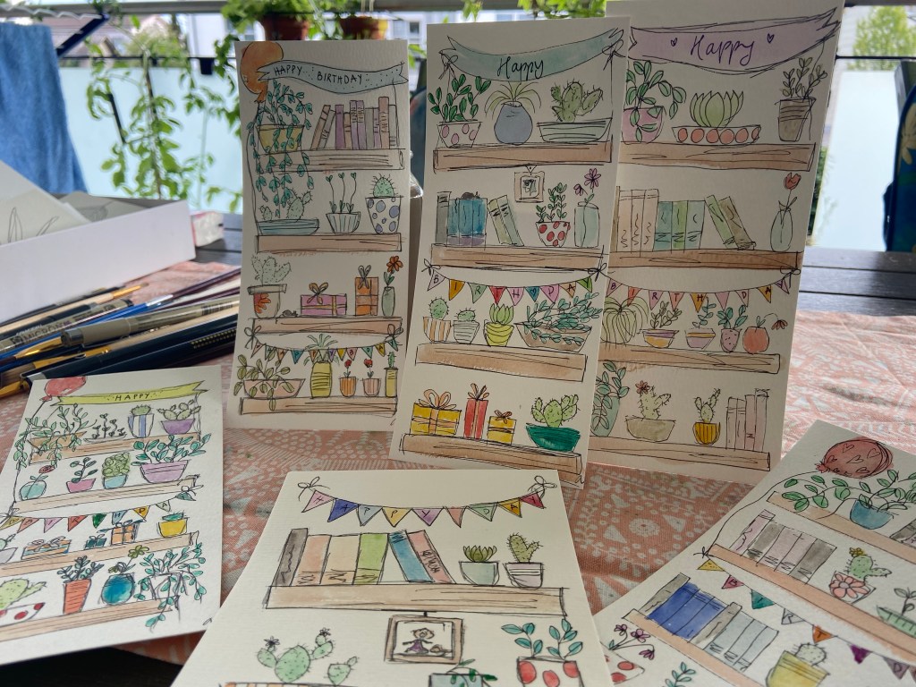 Quadratisch 13,5×13,5 cm, mit Einlageblatt und Kuvert. Jedes ist handgezeichnet und gemalt, jedes ist ein Einzelstück.