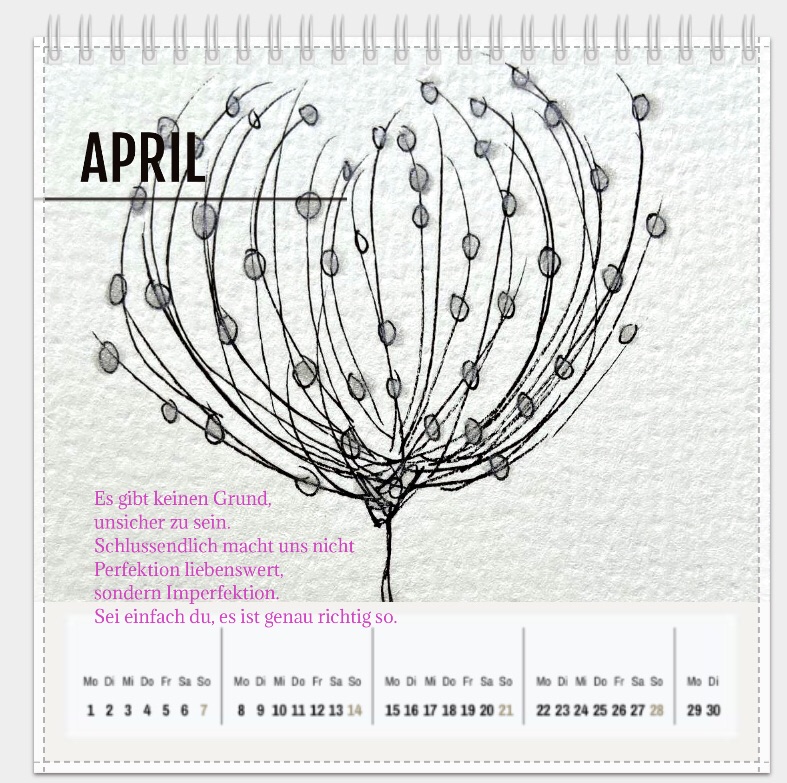 Mein Kalenderblatt für den April sagt, dass es keinen Grund gibt, unsicher zu sein und dass uns nicht Perfektion liebenswert macht, sondern Imperfektion.