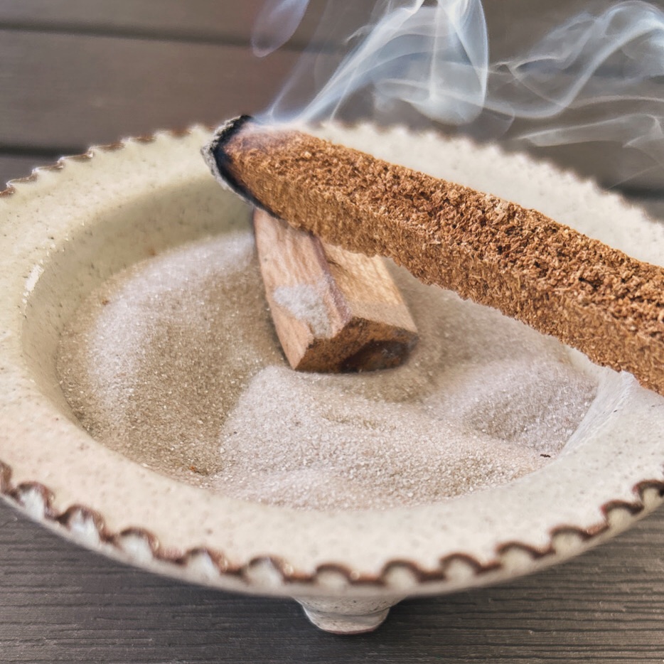 Falls ihr das Abbrennen von Palo Santo ausprobieren möchtet, bitte legt es in eine Räucherschale oder in einer Schale voller Sand, damit nicht noch anderes abbrennt.