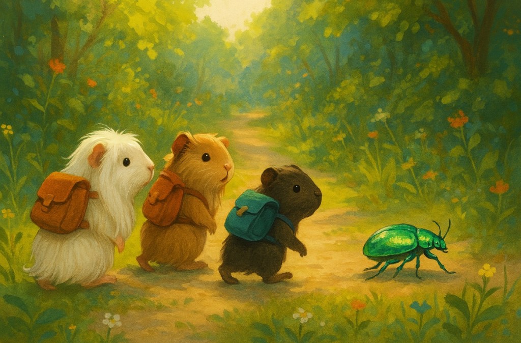 Sie schnappten nach ihren kleinen Rucksäcken (selbst gebastelt aus alten Handschuhen) und packten ein wenig Proviant hinein, denn wir alle wissen ja, dass Meerschweinchen alle paar Minuten etwas fressen müssen und machten sich mit Sir Grünling auf den Weg.