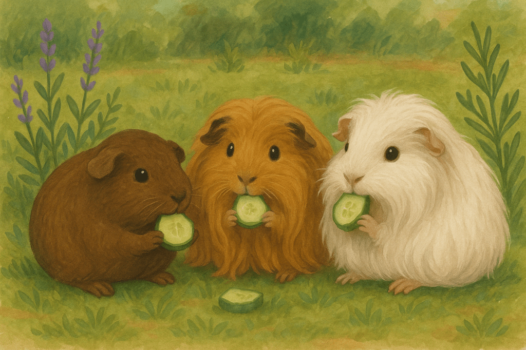 „Er frisst wieder!“, quietschte Arja glücklich. Und die Menschenfrau lächelte erleichtert. Sie brachte für jedes Meerschweinchen ein grosses Stück Gurke aus der Küche mit, denn sie wusste, dass das ihr Lieblingsessen ist.