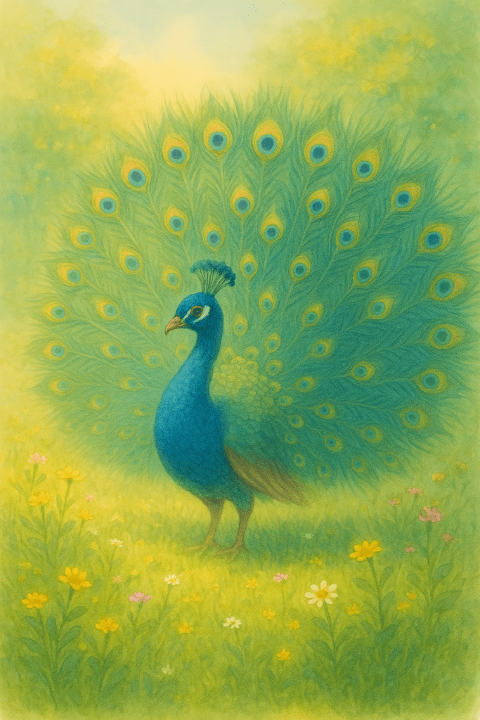Der Pfau drehte sich langsam, stolz und würdevoll, sein Rad glänzte in Blau- und Grüntönen in der Sonne. Und genau in der Mitte fehlte eine Feder.