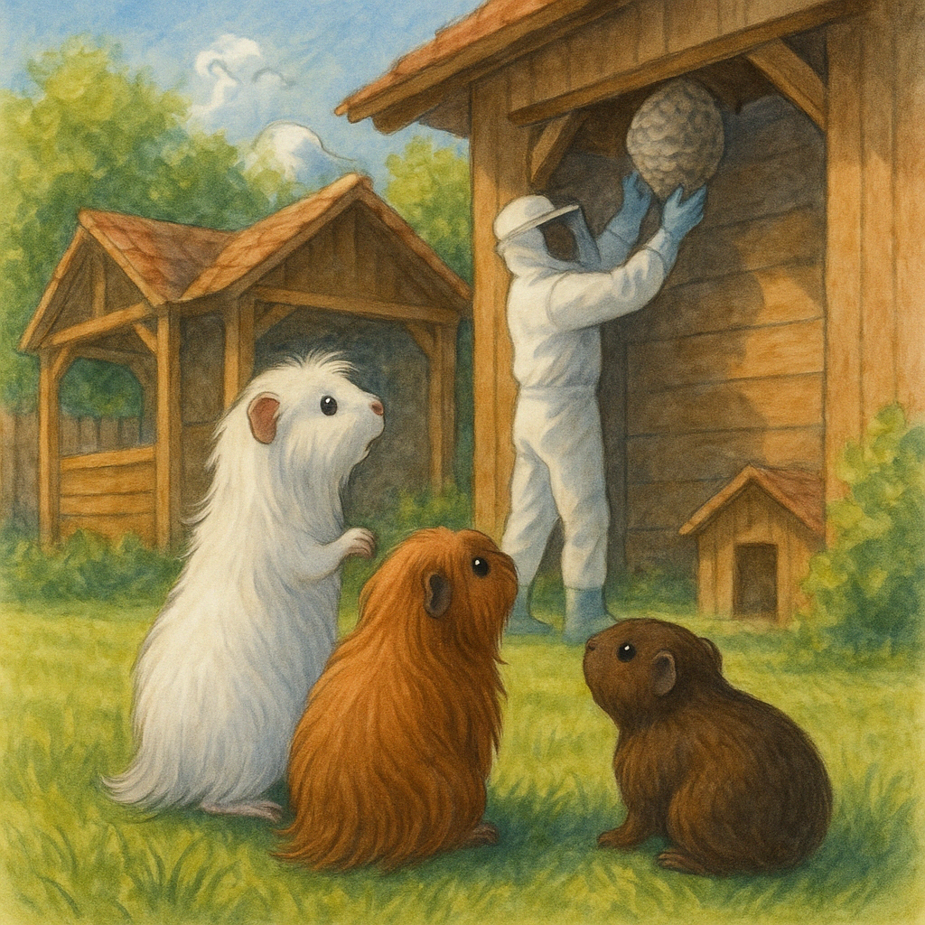 „Ich glaube nicht, dass sie deswegen hier sind“ sagte Arja langsam. Sie stellte sich auf die Hinterbeine und spähte zum Schuppen in der Ecke des Geheges. Dort, unter dem Dachbalken, schwirrten ganz viele kleine gelb-schwarze Wesen herum. Da hing etwas rundes. Eine nach der anderen flog da hinein und kam wieder heraus. Ein mega Gewusel war das dort.