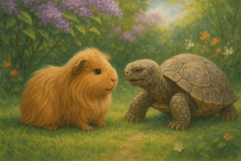 Die Schildkröte verbrachte jetzt ganz viel Zeit mit den Meerschweinchen und sie wurden Freunde.
