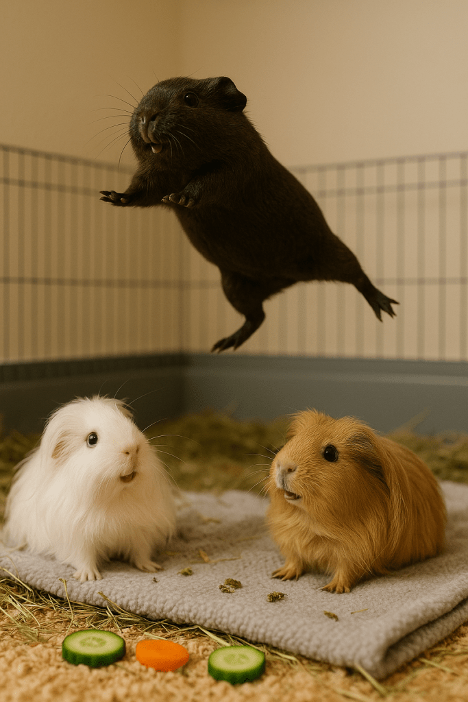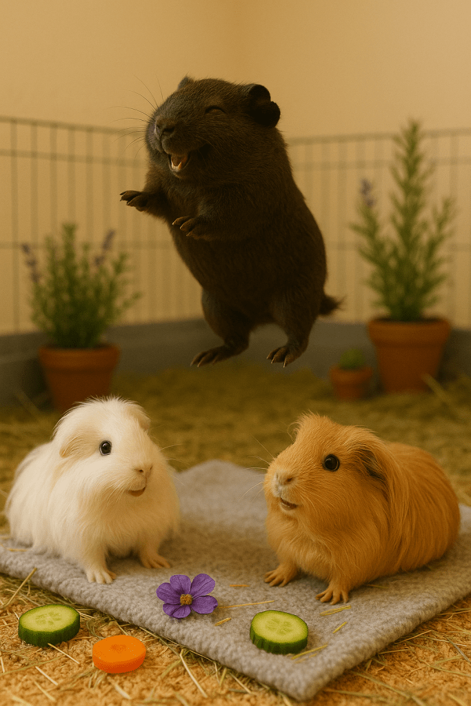 Im Gehege war es ruhig. Nur das Rascheln von Heu und das leise Schmatzen von Tina war zu hören. Arja lag ausgestreckt auf einem weichen Tuch in der Kuschelecke. Jimmy jedoch hockte wachsam in seinem Lieblingshäuschen.