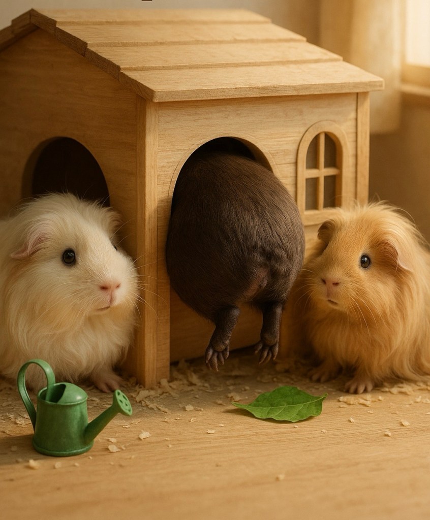 Es war ein ruhiger Morgen im Gehege. Die Sonne kitzelte unsere drei Meerschweinchen ganz sanft auf der Haut, als wolle sie sie aufwecken. Tina und Arja lagen schon wach in ihrem Heu. Nur Jimmy schnarchte noch leise unter seiner Kuscheldecke.