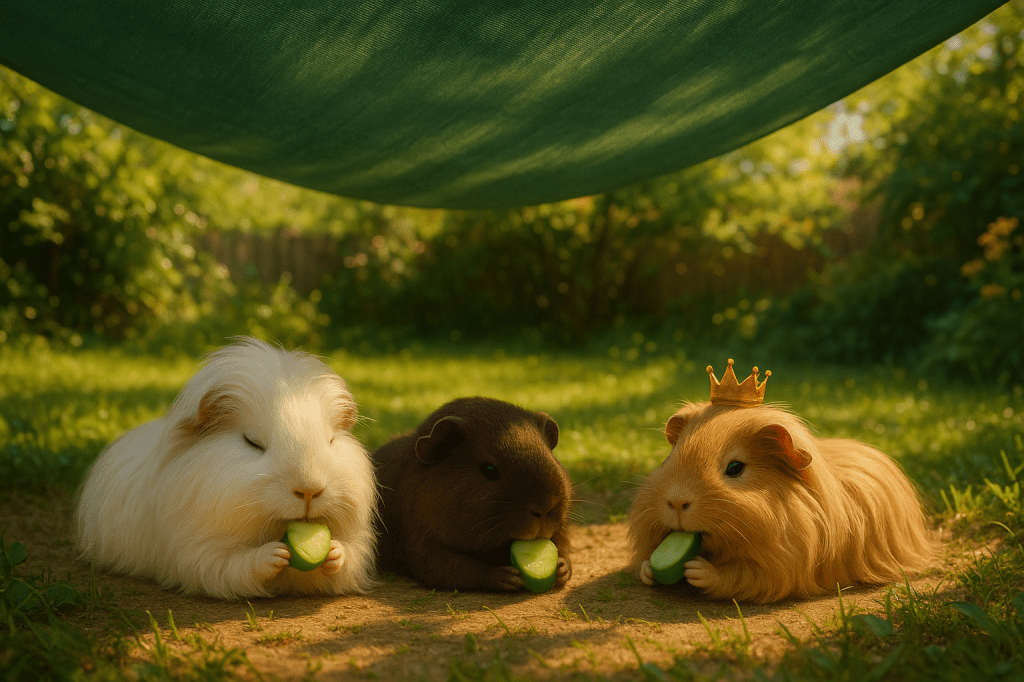 Die Menschen-Mama wischte sich den Schweiss von der Stirn und klopfte den Pfosten, an dem das grosse Sonnensegel befestigt war, noch einmal fest in die Erde. Sie erklärte, dass es ihnen an diesen heissen Tagen Schatten spenden würde, da Meerschweinchen grosse Hitze nicht gut vertragen.