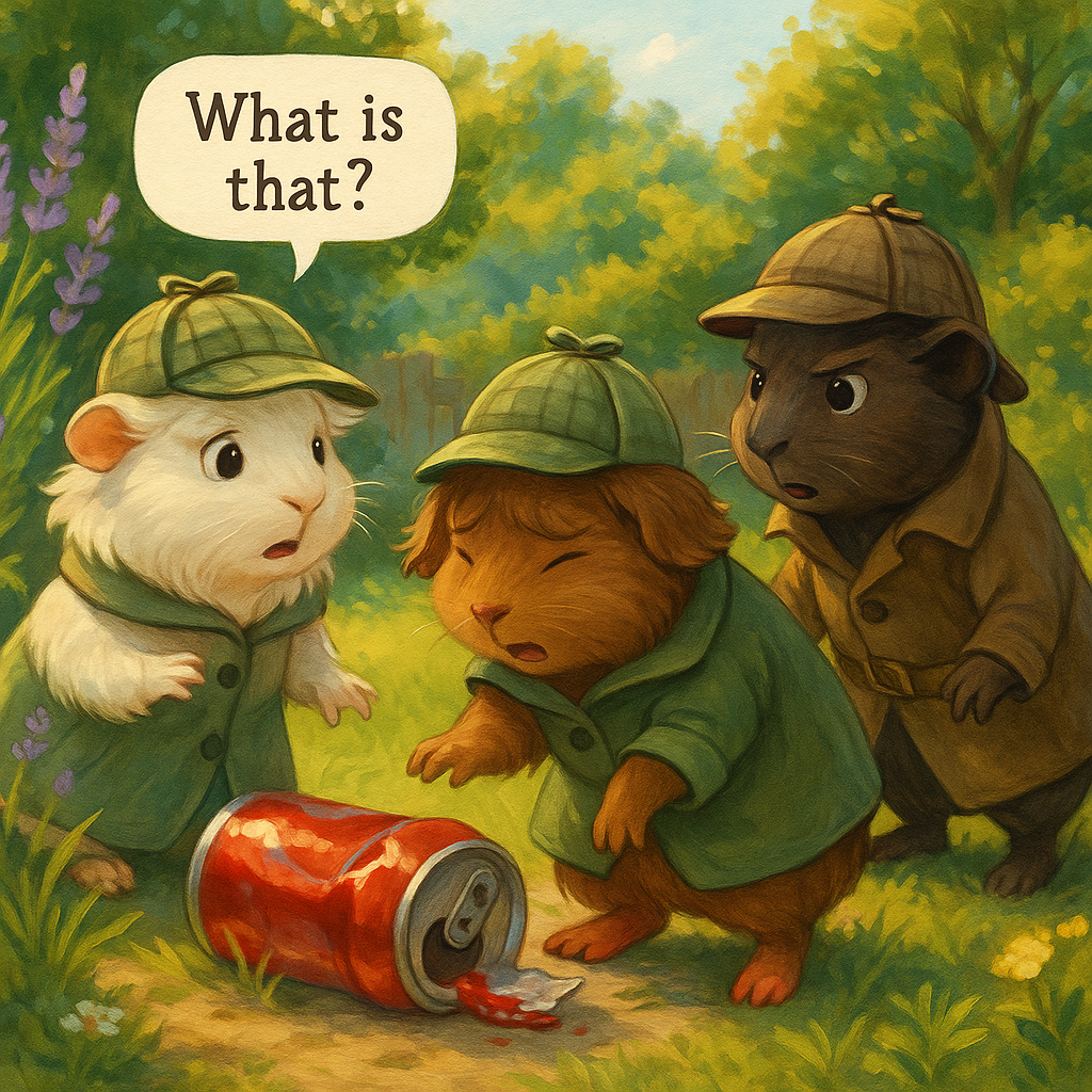 Doch dann geschah etwas ganz Merkwürdiges. Mit einem Pling! flog plötzlich vom Gehweg aus, der ausserhalb des Gartens war, etwas Glänzendes über den Gehegezaun und landete mitten auf dem Weg zwischen dem Gehege und dem Kompost. Es rollte noch ein kleines Stück, klirrte gegen einen Stein und blieb dann liegen. Die drei Meerschweinchen schreckten auf.