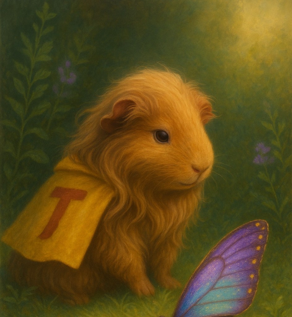Tina war als Erste draussen. Ihr langes, hellbraunes Fell flatterte leicht im Wind, und der gelbe Umhang mit dem grossen „T“ leuchtete in der Morgensonne. Sie schnupperte neugierig am Boden, als etwas Glänzendes im Gras ihre Aufmerksamkeit erregte.