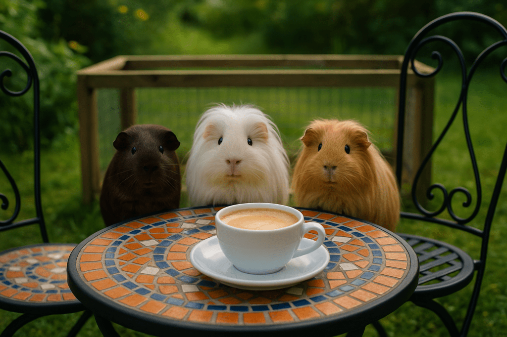 Mach ein Bild von einem Mosaiktischlein wie ein Bistro-Tisch im Garten mit zwei Stühlen. Im Hintergrund, im Garten, einfach im Gras, sind unsere drei Meerschweinchen. Jimmy mit dem dunkelbraunen kurzen Fell, Arja mit dem weissen langen Fell, und Tina mit dem hellbraunen langen Fell. Im Hintergrund sind sie auf dem Gras. Auf dem Bistro-Tisch steht ein Cappuccino.