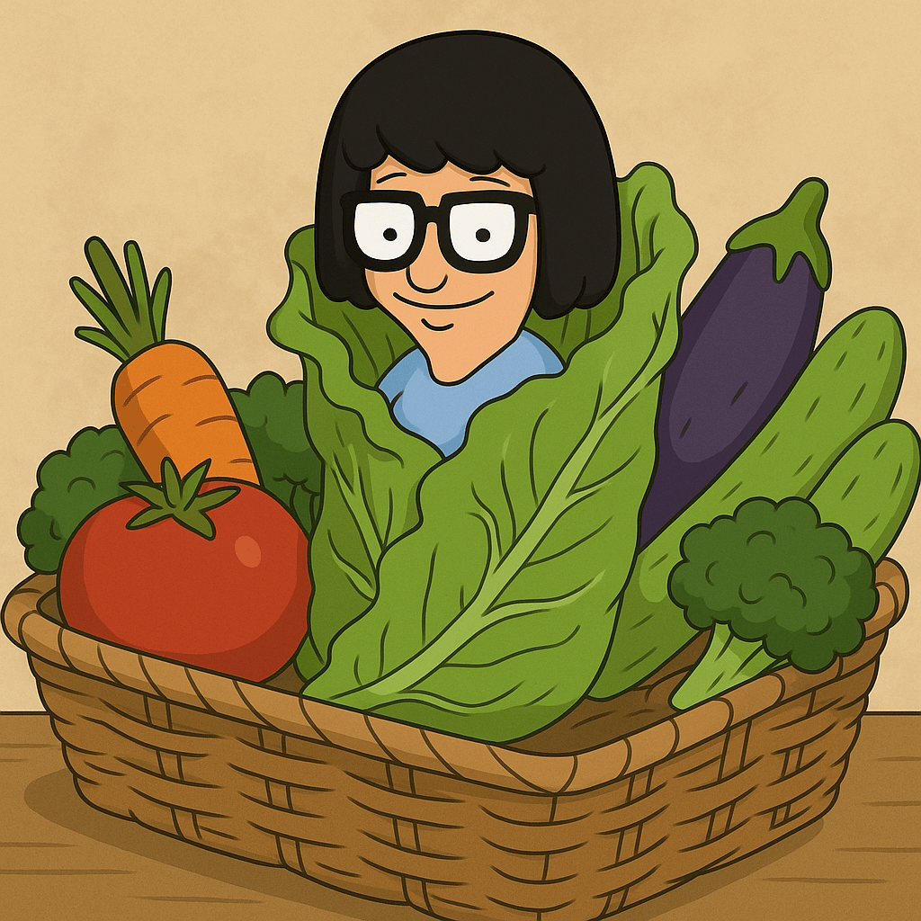 Mach folgendes Bild: Tina wickelt sich im Gemüsekorb in ein Salatblatt ein.