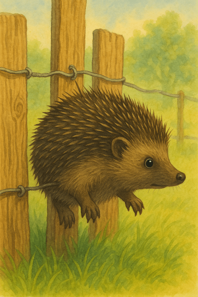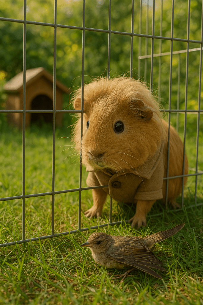 Tina sieht ausserhalb des Geheges einen verletzten Vogel. Tina ist das Meerschweinchen mit dem langen, hellbraunen Fell. Sie ist im Gehege. Der Vogel liegt ausserhalb:
