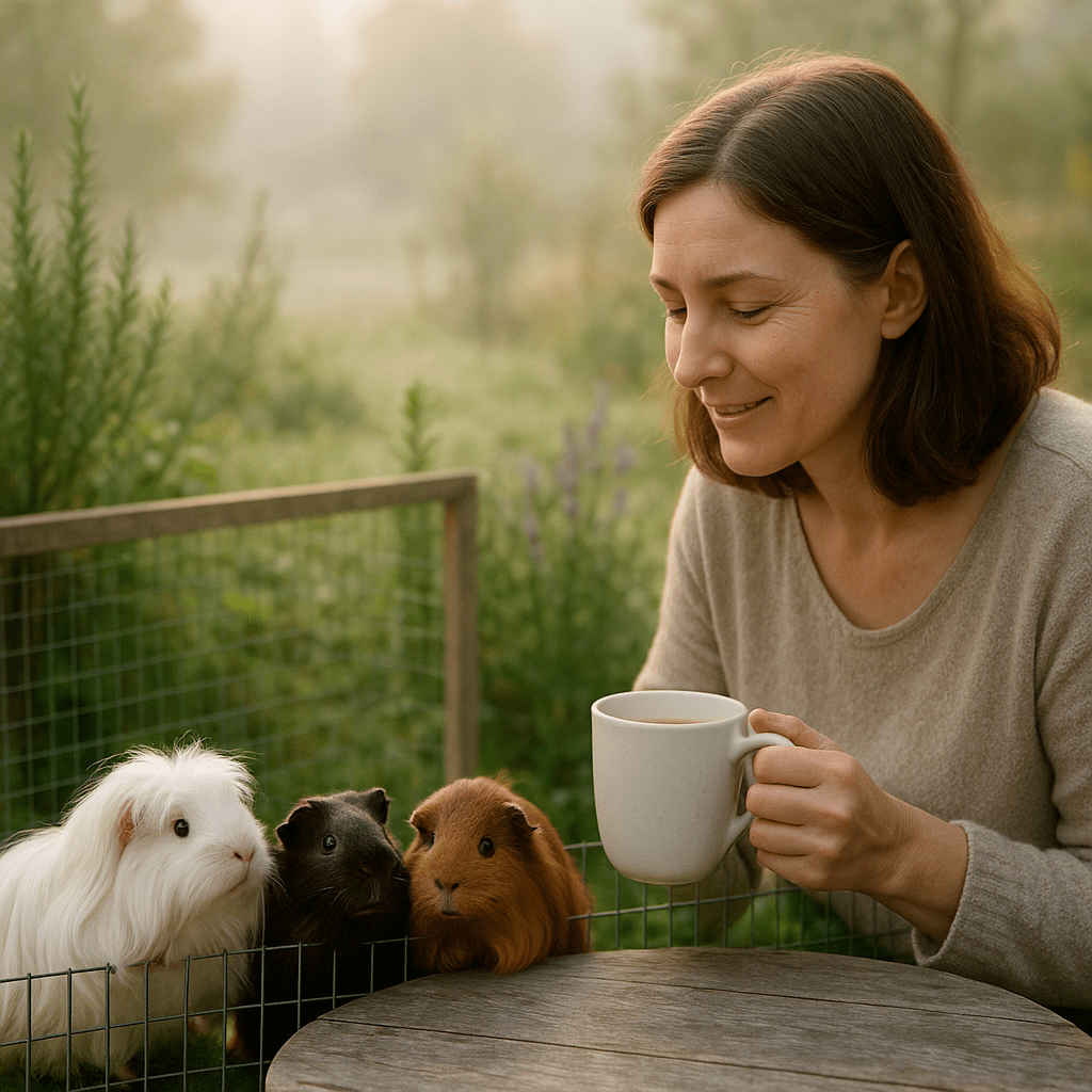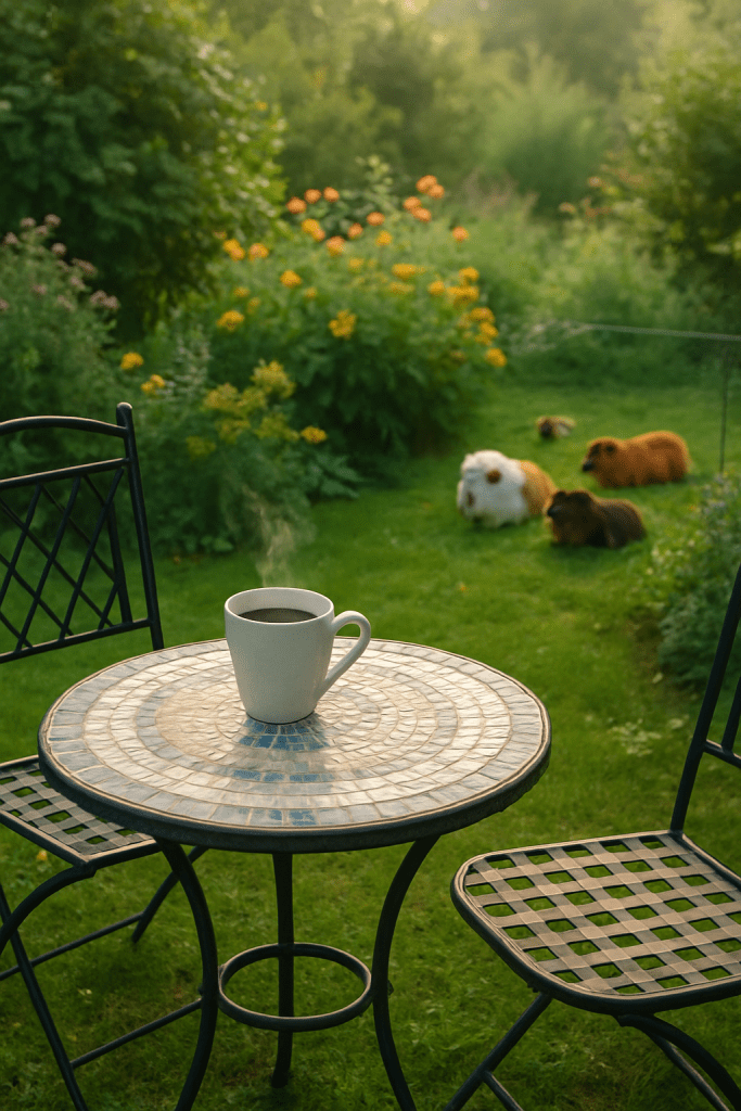 Mach ein Bild von einem schönen Garten. Dort steht ein Tischchen mit einer Kaffeetasse drauf. Unsere drei Meerschweinchen im Hintergrund, keine Frau.