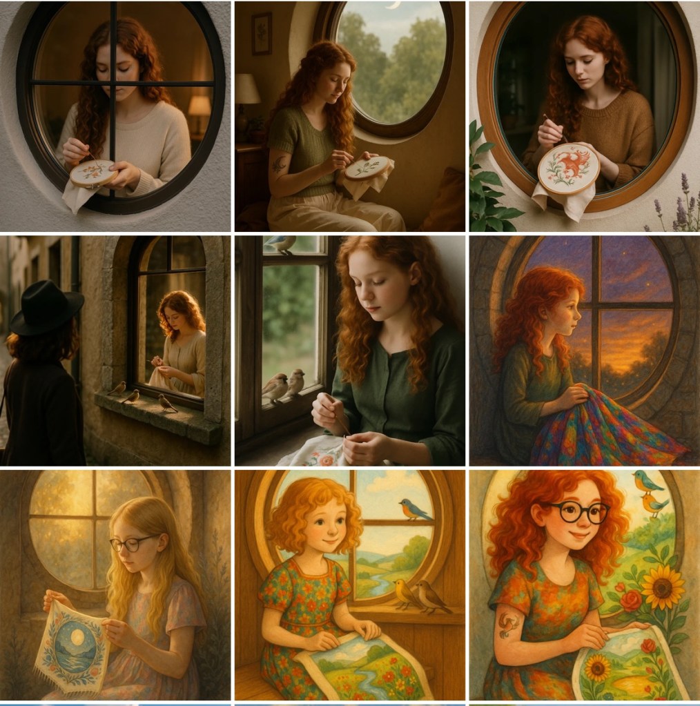 Mach ein folgendes Bild: durchs Fenster eines Hauses sieht man, wie ein Mädchen am Fenster sitzt und stickt. Das Fenster ist rund. Das Mädchen hat lange, rote Locken. Viele Versuche…