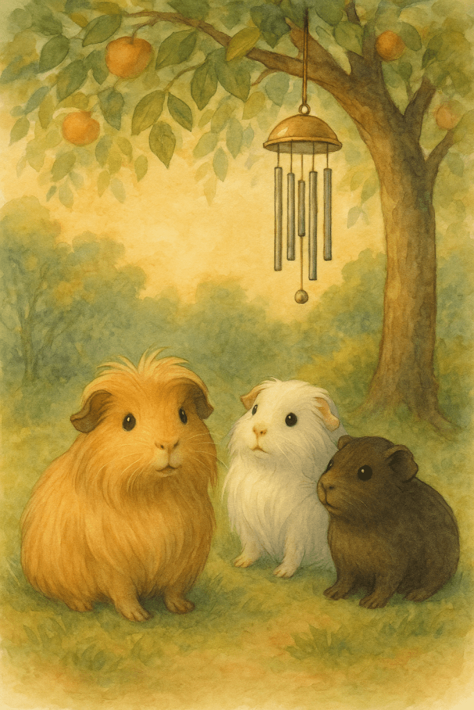 Doch Tina wusste es sofort. Mit kleinen, entschlossenen Schritten ging sie los, ihre Haare schimmerten golden im Abendlicht. Arja und Jimmy folgten ihr neugierig. Sie gingen vorbei am Himbeerstrauch, am alten Holzstamm, und schliesslich blieben sie unter einem Apfelbaum stehen. Dort, hoch oben in den Ästen, hing ein kleines Windspiel. Bunte Glöckchen und dünne Metallstäbe bewegten sich sanft im Wind und liessen die zarte Melodie erklingen.