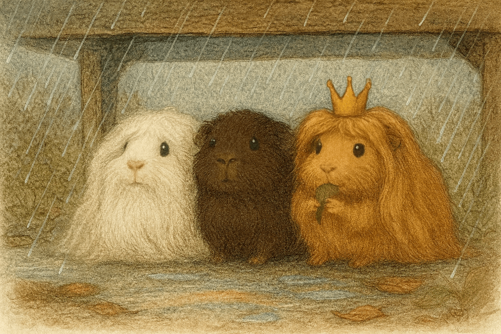 Als die drei kleinen Superhelden am Morgen aus ihrem Häuschen krochen, trommelte der Novemberregen sanft auf das Dach des Geheges, auf die Blätter, auf den Boden, auf alles, was der Garten zu bieten hatte.