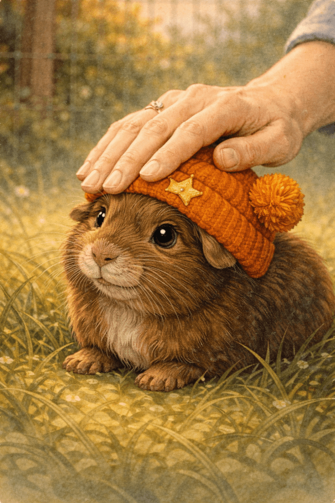 Jimmy war ganz verdattert. Aber dann lief er zu ihr hin, ganz nah. Er schnupperte und sie roch nach Eukalyptus und Kamille. Sie nahm ihn auf die Hand und streichelte ihn. Er liebte es, wenn sie das tat und ihm sagte, was für ein liebes Meerschweinchen er ist. In diesen Momenten durchflutete es ihn vor Liebe und Wärme und er schaute sie mit seinen schwarzen Augen lieb an.